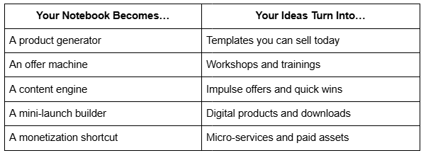 This entire system is designed so you can take the notebook you already have and start turning pages into products, ideas into offers, and scattered thoughts into income.