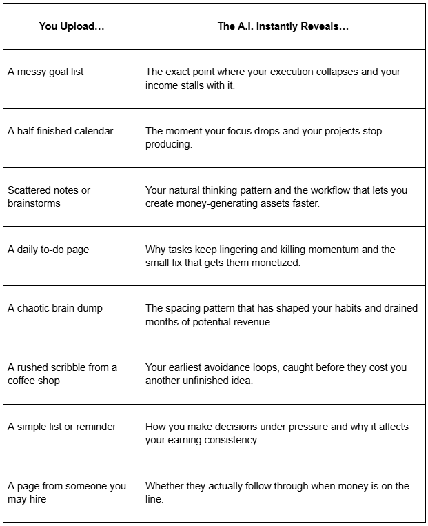 Upload your worst, messiest, most embarrassing abandoned notebook page. If the system does not reveal at least one hidden behavioral pattern, one quit trigger, or one execution bottleneck that makes finishing feel easier and more profitable, I refund your $17 and you keep everything.